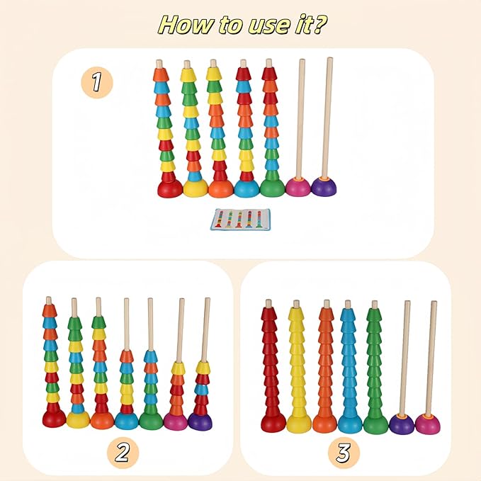 Fine movements: Children need to accurately put rings of different colors and sizes on the pillars to exercise fine hand movements and hand-eye coordination.
