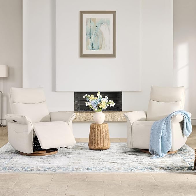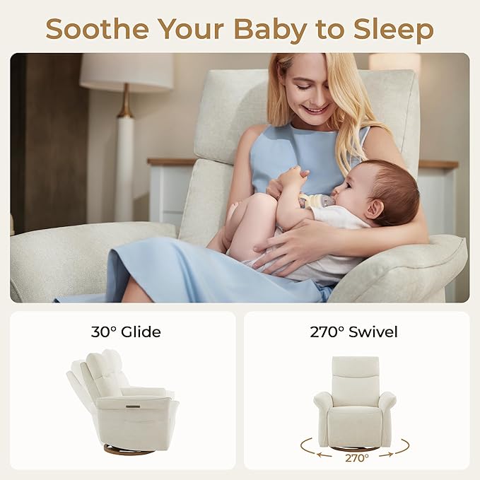 - Luxury Triple-Motor Power Swivel Nursery Glider: Elevate your nursery experience with this advanced power recliner chair, engineered for unparalleled comfort. A triple-motor power control system enables 270° swivel, smooth gliding and effortless 90-135° recline at the push of a button. Adjustable power headrest and lumbar support eliminate the need for extra pillows, cradling your body in every position.