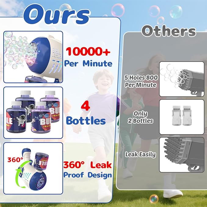 - HIGH BUBBLE OUTPUT: Create a bubble storm with 10,000+ bubbles per minute, delivering an exciting and immersive bubble wonderland. Designed with leak-proof, shatter-resistant ABS material, it’s a durable and safe companion for hours of outdoor adventure