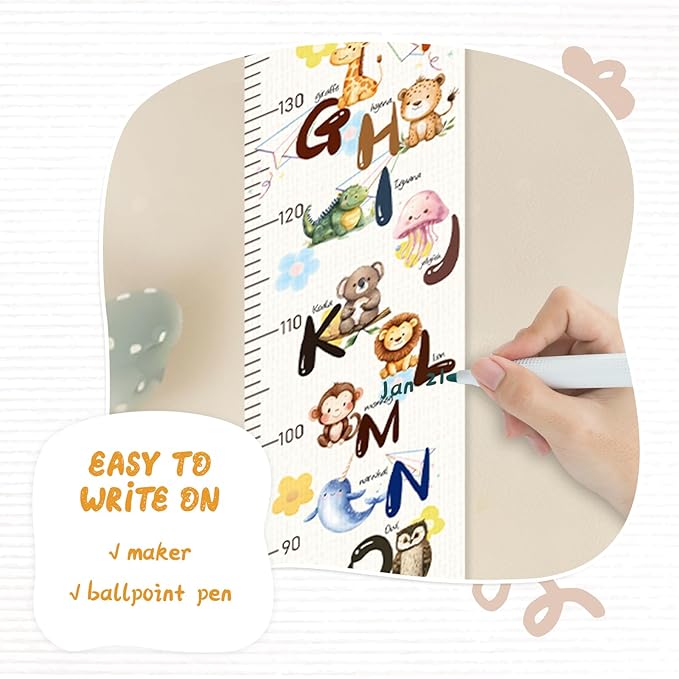 - Design: Kids growth chart with rope at the top of the chart, easy to install and removeable, foldable and portable design, easy to store, hang, roll up, transport, and save space. It boasts a material that's easy to write on, where you can use dark colored ballpoint pens and markers to track growth milestones. Our height ruler can clearly show your kids' height.