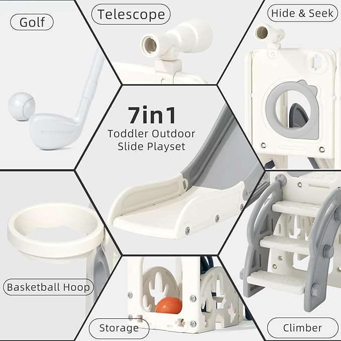 7-in-1 Activity Center: Compact playset combines a slide, climbing stairs, hide-and-seek hole, storage space, telescope, basketball hoop with ball, and golf set for versatile skill-building and imaginative play.