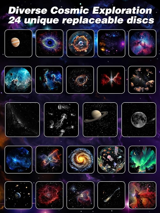 - Wide Variety of Discs: Discover a stunning collectionβfrom constellations and starry skies to the Milky Way and planetary scenes. This projector brings the awe-inspiring beauty of space right into your room. We've thoughtfully curated a special disc set for kids to ignite their curiosity and inspire a love for exploring the universeβwith even more exciting discs on the way.