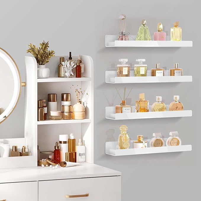 4 Pack 15 Inch Whtie Acrylic Shelves, Kids Floating Bookshelf for Kids Room, Modern Nail Polish Rack Sunglasses Essential Oil Picture Ledge Display Toy Storage Wall Shelf
