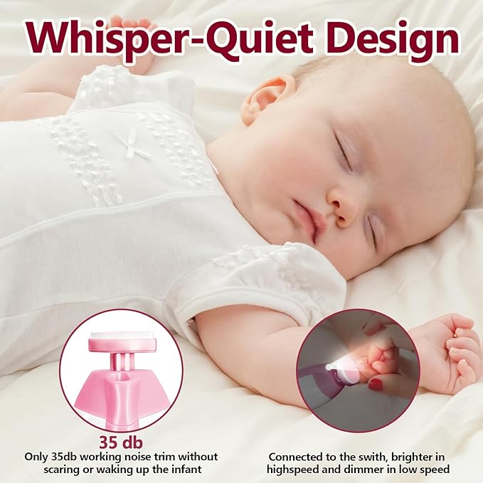 Low Noise – The Baby electric nail trimmer is equipped with a whisper-quiet design. Only 35dB operating sound. You can file nails even as the baby sleeps, without causing any disturbance. You can use it in the dark at night.