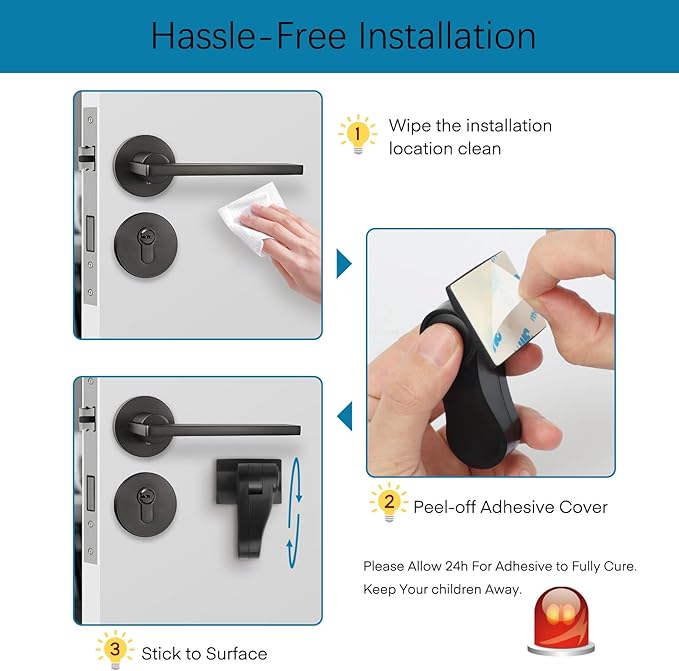 Easy to Install and Remove: No need tools. Peel the damage-free 3M adhesive and place the Baby Safety Door Handle Lock on the door. Use hair dryer will help you remove the lock without any residue