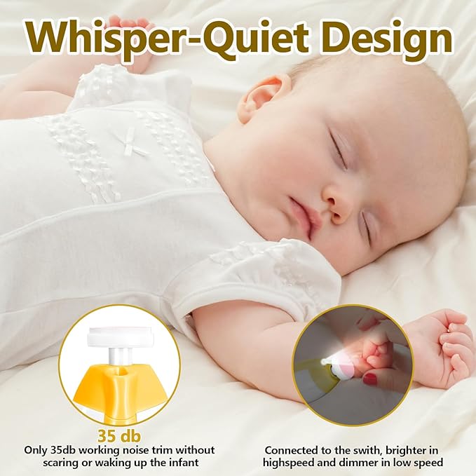 - Low Noise – The Baby electric nail trimmer is equipped with a whisper-quiet design. Only 35dB operating sound. You can file nails even as the baby sleeps, without causing any disturbance. You can use it in the dark at night.