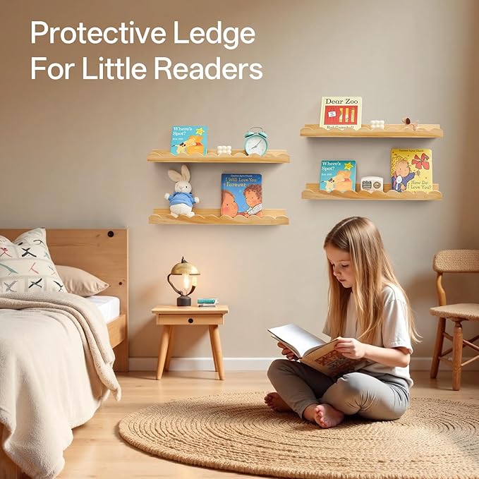 - 【🏡Stylish Scalloped Design】 This scalloped floating shelves has a scalloped rounded front with smooth rounded corners and a minimalist design that is child friendly to use while adding a touch of sophistication to any room. Perfect for organizing bookshelf, toys and school materials, this nursery book shelves can also be used as children's room décor to add a cute and fun element to their room