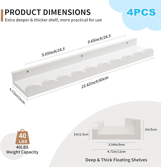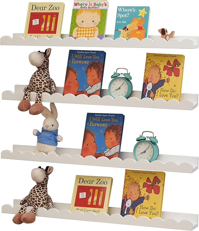 - 【🏡Stylish Scalloped Design】 This scalloped floating shelves has a scalloped rounded front with smooth rounded corners and a minimalist design that is child friendly to use while adding a touch of sophistication to any room. Perfect for organizing bookshelf, toys and school materials, this nursery book shelves can also be used as children's room décor to add a cute and fun element to their room