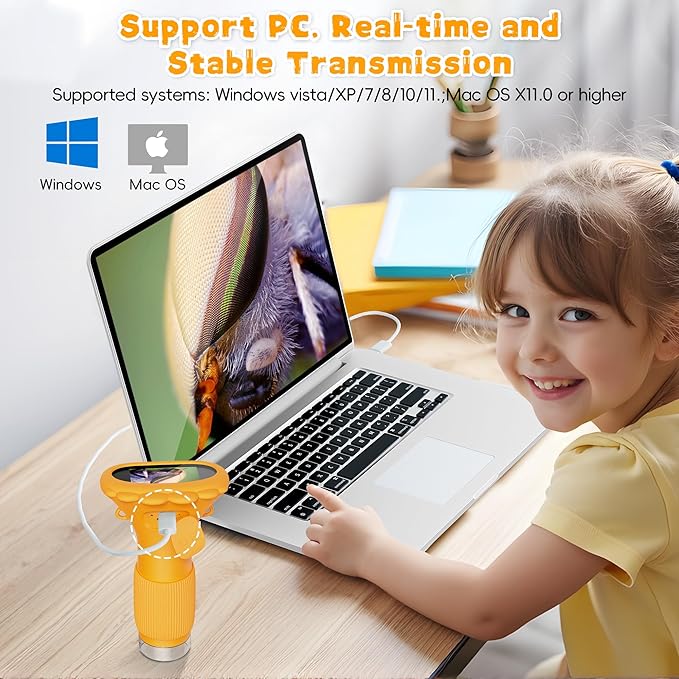 - PC Connection & fun sharing: The USB digital microscope can be connected to a computer via the included USB cable for large-screen real-time viewing, supporting Windows Vista/XP/7/8/10/11, MacOS X 11.0 or later; or save and share kids' explorations and discoveries with family and friends.