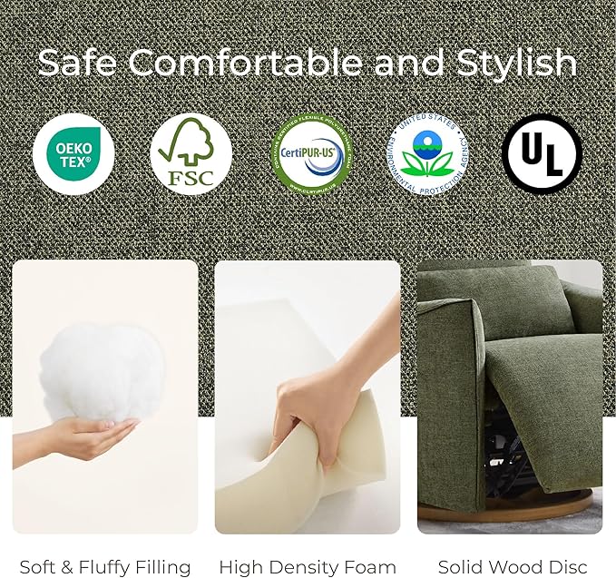 - Certified Safety & Sturdy - Your safety and peace of mind are our top priorities. This nursery glider recliner features an EPA-certified wooden frame. Its fabric meets OEKO-TEX standards, and the foam is CertiPUR-US certified, collectively ensuring a safe and healthy environment for you and your baby. The electrical components are TUV, UL, and ROHS certified, providing protection against electric shocks, fires, and other potential hazards. Plus, with a patented Leggett & Platt mechanism that supports up to 350 lbs, it offers lasting durability and stability.