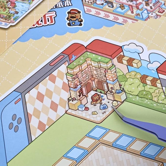 - 6 LARGE VARIOUS SCENES: The sticker set includes 6 sticker sets, 6 background boards, and a tweezer. Scenes feature a Dream Circus, Arcade, Chocolate Factory, Dream Clothing Store, Magic House Town, and Strawberry Workshop. Mix and match for endless DIY 3D house creations!