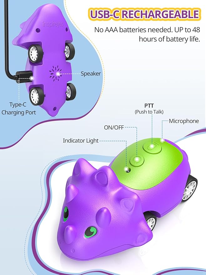 - [Rechargeable, Long-Lasting] : No more wasting money on endless AAA batteries! Each dino walkie-talkie toy car charges easily with the included USB-C cable and lasts up to 48 hours on a single charge, keeping the dino adventures going anytime, anywhere. Please Note: The included cables are designed for these dinosaur toys only and should not be replaced with other cords.