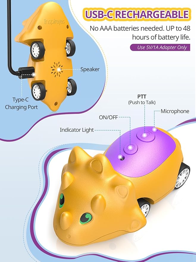 - [Rechargeable, Long-Lasting] : No more wasting money on endless AAA batteries! Each dino walkie-talkie toy car charges easily with the included USB-C cable and lasts up to 48 hours on a single charge, keeping the dino adventures going anytime, anywhere. Please Note: The included cables are designed for these dinosaur toys only and should not be replaced with other cords.