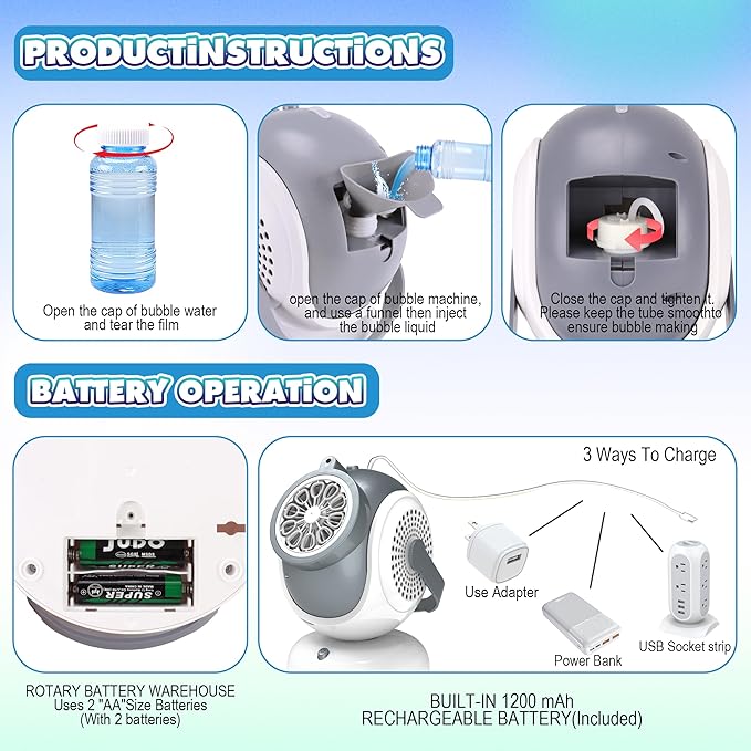 - Efficient Blowing of Big Bubbles - Equipped with a powerful motor, it can blow tens of thousands of bubbles per minute. Create a romantic bubble atmosphere, children open their eyes excitedly, watching the sea of bubbles flying in the air. The design of LED lights adds a touch of magical charm to these glowing bubbles, suitable for evening parties or outdoor night activities.