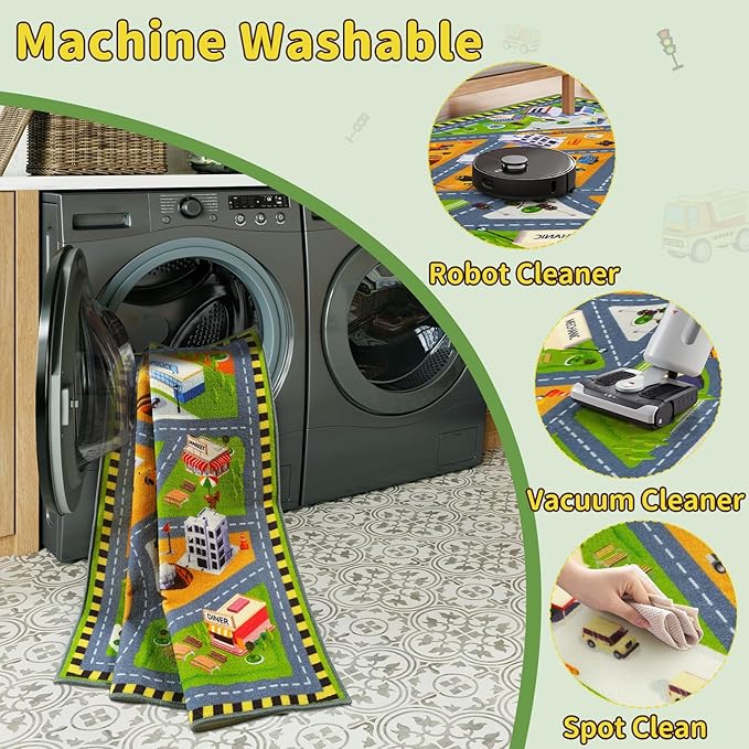 - 【Easy to Clean】This kids rug is machine washable, making it a practical choice for busy parents. Our stain-resistant road rug is a perfect choice for your kids room. For everyday care, simply vacuum it. When a deeper clean is needed, just toss it in the washing machine using cold water and a mild detergent to keep it looking fresh and vibrant