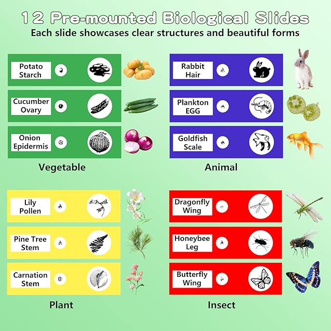 - 12 Extra Slides & Perfect Gift: Includes 12 carefully selected plastic slides covering four categories: plants, vegetables, insects, and animals. Each slide showcases clear structures and beautiful forms, blending education with fun. This kids microscope toys set is both entertaining and educational, making it an ideal gift for boys and girls aged 3 to 12 on birthdays, holidays, Christmas, or as a learning reward.