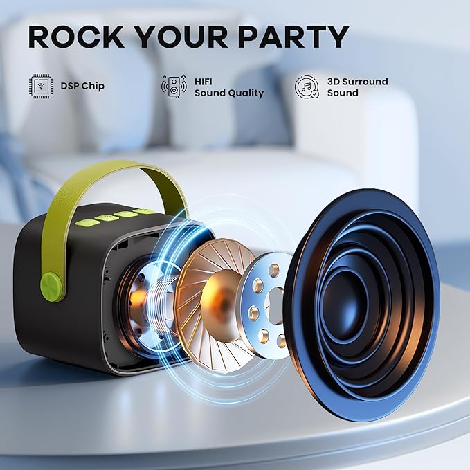 - PLAY ANY SONG - Instant Bluetoothed to your Smartphones and tablets with great stability, and play all your favorite songs. From then on, it connects automatically. One Simple Setup, tiny fingers can power up the magic in seconds. Also support TF card (not included) playing. At the same time, plug in your headphones, sing and listen to your own singing voice, good helper for singing practice. Moreover, one key to reduce or restore vocals from Bluetooth music, sing along with the rhythm and have fun.