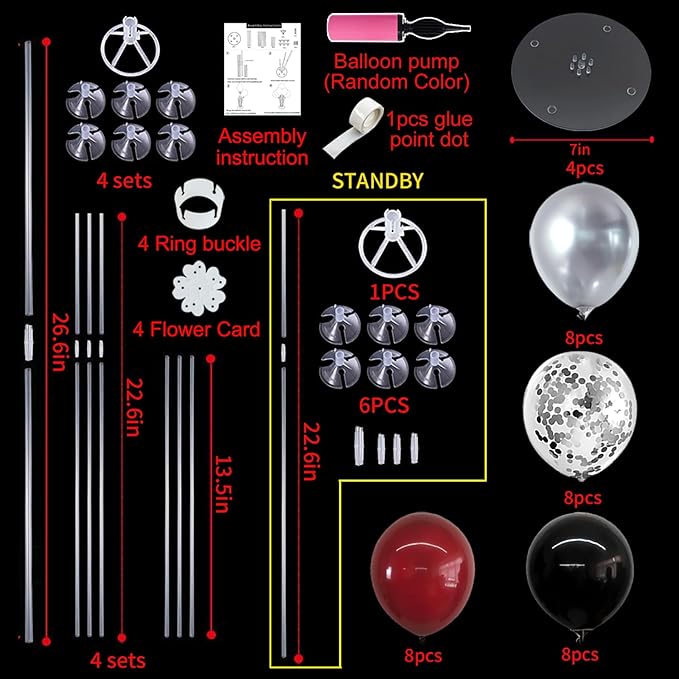 - Package Includes: The balloon arch kit includes 4 reusable balloon stands and 12 inch 32 pcs red and black balloonsοΌ8 burgundy red balloons,8 black balloons,8 silver balloons and 8 silver confetti balloonsοΌ,glue point dots,balloon pump,balloon clips,and tie tool.You donβt need to waste money to buy balloons