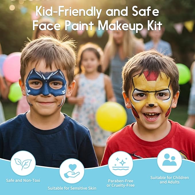 - Kid-Safe Halloween Makeup Kit: Water-activated, non-toxic face paint formulated with cosmetic-grade ingredients for sensitive skin. Paraben-free, cruelty-free, and safe for both kids and adults. Always perform a patch test on a small area of skin before full application