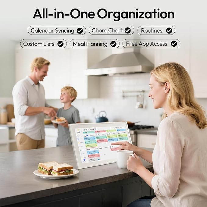 - [Interactive Chores Chart & Dinner Planner] Our digital calendar keeps housework organized and motivates family members, especially children, to develop healthy habits with an interactive chore chart. Display your family dinner plans to keep everyone informed and eliminate the daily "What's for dinner?" question.