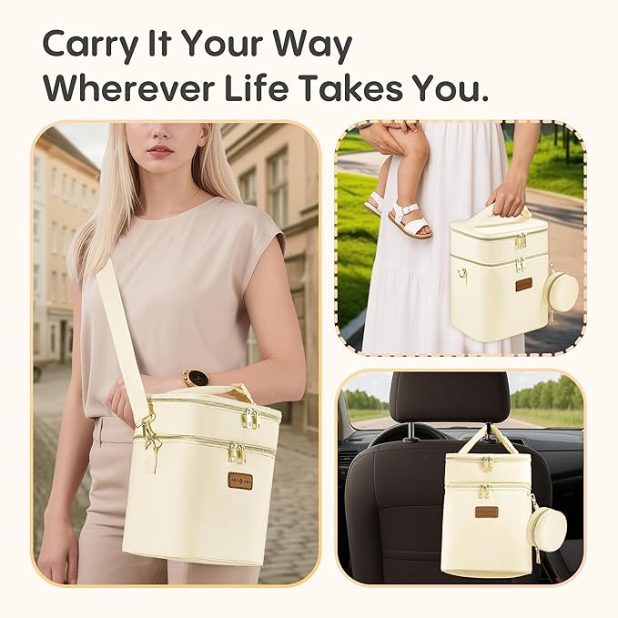 - 1️⃣ Large Capacity for Pumping Moms Holds up to 6 standard 9oz bottles in the bottom compartment. The top layer stores wearable pumps, snacks, or accessories—perfect for daily use or long outings