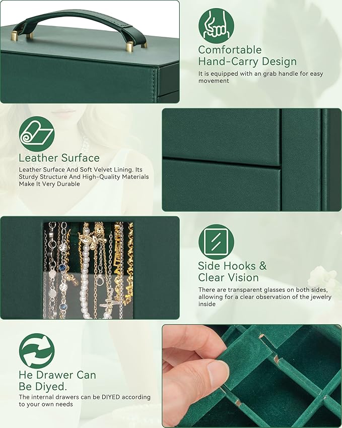 - 【Large Capacity,More Storage Space】With 6 versatile pull out drawers, and additional ring and earring storage at the back,this jewelry box can store a lot of jewelry accessories, such as rings, earrings, necklaces, chains, bracelets and so on. One deeper drawer is designed for watches,sunglasses or large jewelries