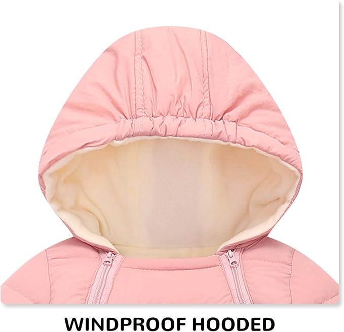 • Clothing design: baby snowsuit is made of high-quality polyester fabric, fluffy and soft fabric to let the baby feel warm and comfortable, snowsuit toddler comes with a windproof hood and elastic band sleeves to keep your baby from catching cold.