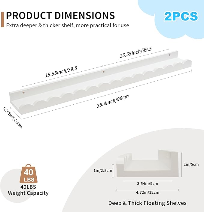 - 【🏡Stylish Scalloped Design】 This scalloped floating shelves has a scalloped rounded front with smooth rounded corners and a minimalist design that is child friendly to use while adding a touch of sophistication to any room. Perfect for organizing bookshelf, toys and school materials, this nursery book shelves can also be used as children's room décor to add a cute and fun element to their room