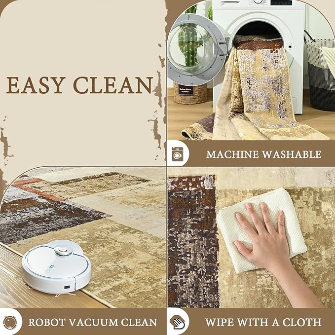 - Machine Washable Area Rug: Washable carpets offer the convenience of saving time and labour. The live water cycle provides a more thorough clean and get rid of stubborn stains and smells. For small stains, use a cleaning agent and a damp cloth to spot clean, or use a vacuum cleaner