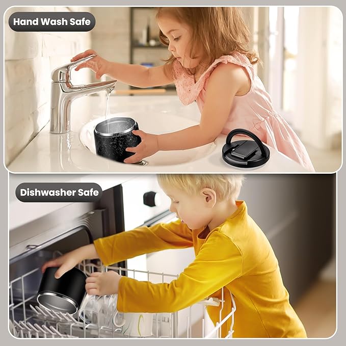 - New Buckle of Lid: The food containers feature a press-seal construction, allowing you to simply pull the handle upwards to 90° to open the lid/ 90° downward closure. This design is maintaining vacuum no need to rotate the lid open . Additionally, the container comes equipped with a carrying handle, making it convenient for your child to carry it. Whether at school, an outdoor outing, or a family gathering, this user-friendly design empowers children to confidently enjoy their delicious meals.