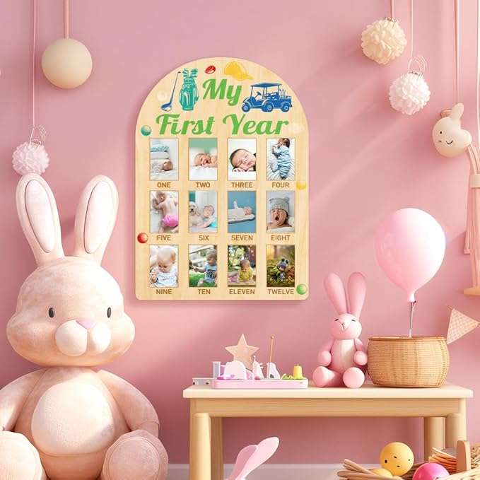 ORIGACH My First Year Baby Growth Photo Display Wood Board - 12 Months Newborn Milestones Photo Board - Neutral Baby Keepsake Frame 1st Birthday Party Nursery Decor New Mom Gift - Golf Element