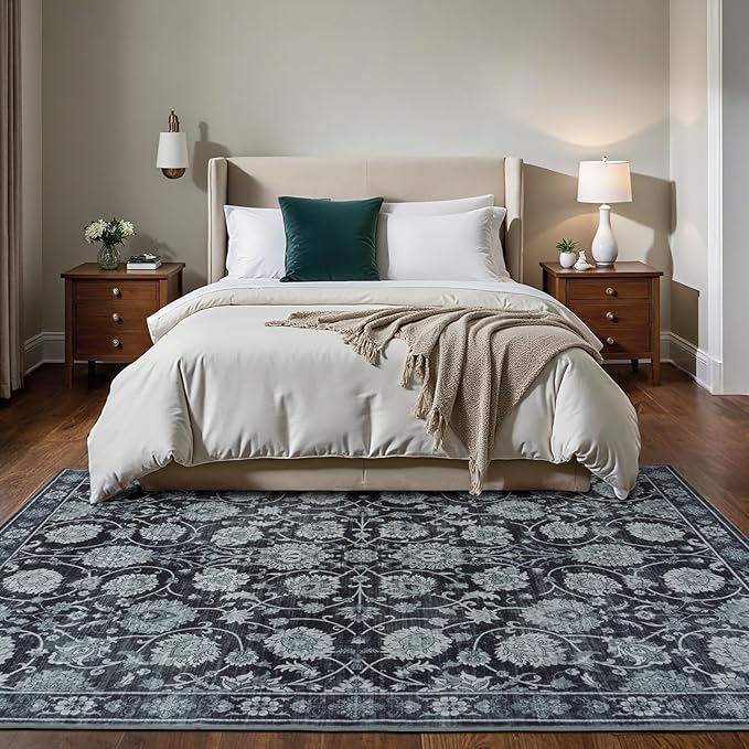 6x9 Area Rug for Living Room & Bedroom, Washable Non-Slip Vintage Distressed Rugs, Floral Soft Carpet, Low Pile Wool Carpets for Indoor Dining Home Office Playroom Under Table, Black