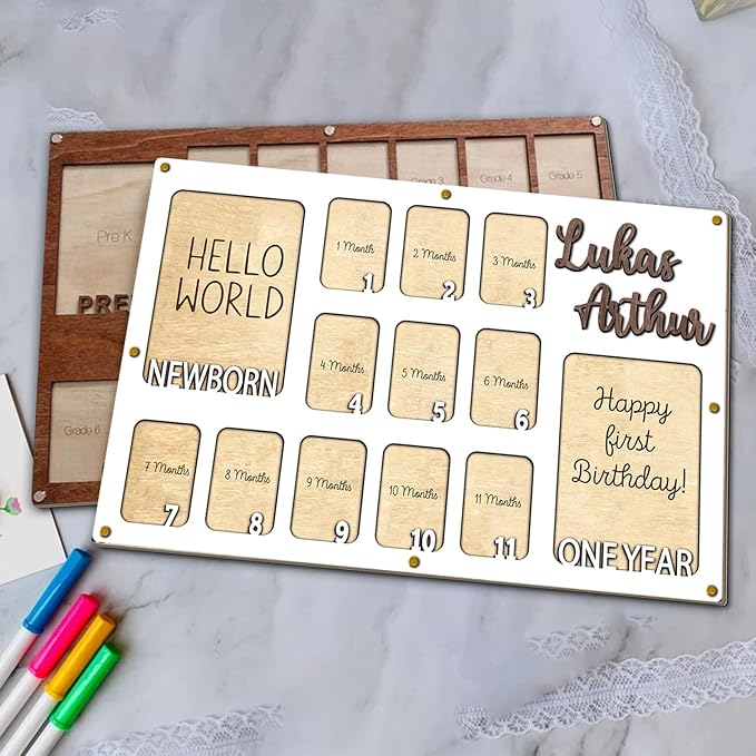 - Capture your baby’s first year with our babys first year photo frame. This baby first year photo frame helps you record their growth from newborn to one year, showcasing each milestone in a 12 month picture frame for baby first year. The wooden plaque includes space for your baby’s full name, making it a personalized keepsake. Our my first year photo board, one year photo board is a wonderful way to celebrate these moments, and the nursery picture frames add a special touch to any room.