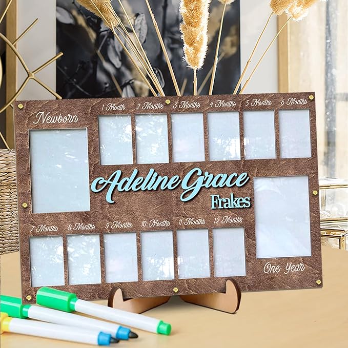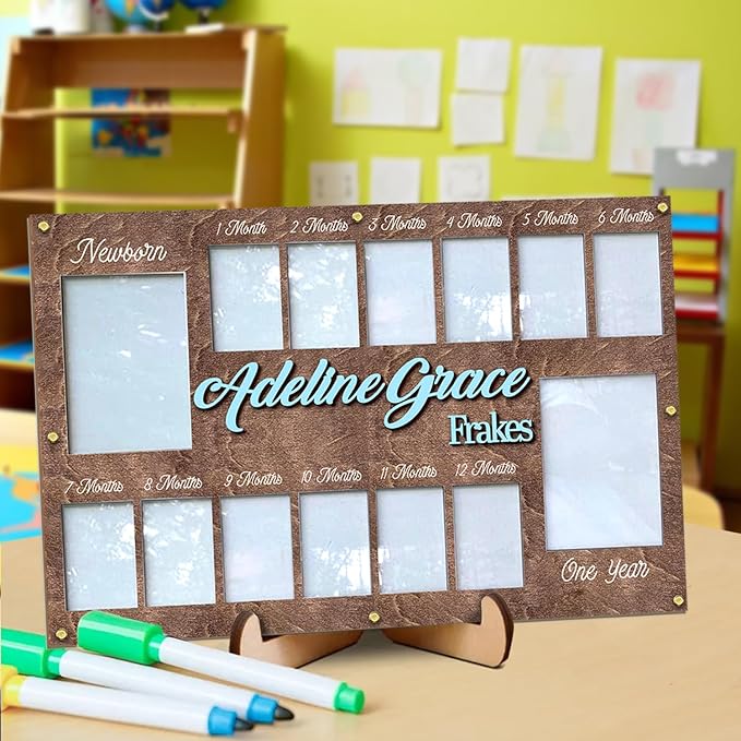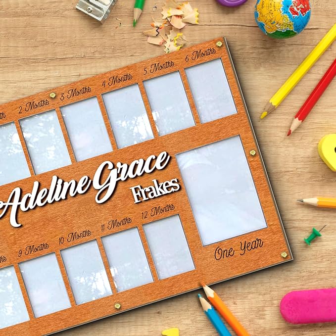 - My First Year Photo Frame: Capture your baby’s first year with our babys first year picture frame. This baby first year photo frame helps you record their growth from newborn to one year, showcasing each milestone in a 12 month picture frame for baby first year. The wooden plaque includes space for your baby’s full name, making it a personalized keepsake. Our 12 month pictures for baby first year, my first year photo board, one year photo board is a wonderful way to celebrate these moments.