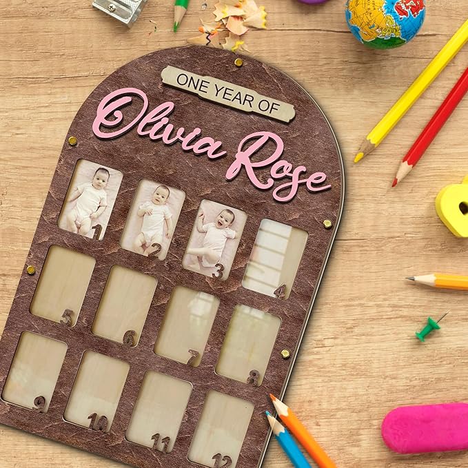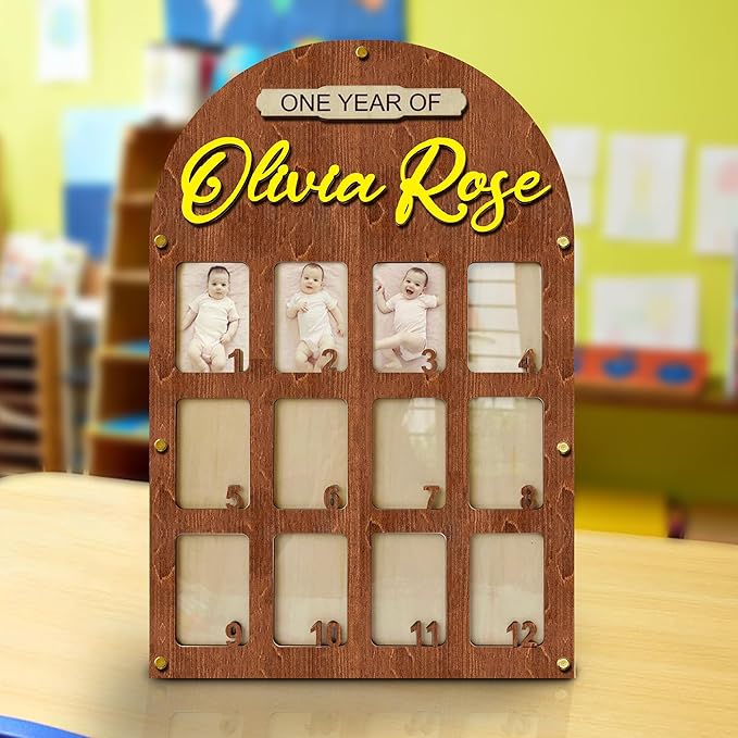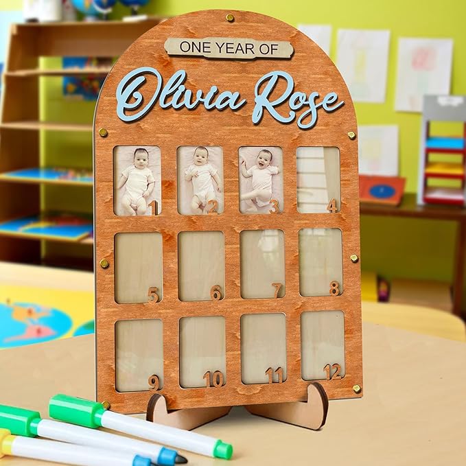 - My First Year Photo Frame: Capture your baby’s first year with our babys first year picture frame. This baby first year photo frame helps you record their growth from newborn to one year, showcasing each milestone in a 12 month picture frame for baby first year. The wooden plaque includes space for your baby’s full name, making it a personalized keepsake. Our 12 month pictures for baby first year, my first year photo board, one year photo board is a wonderful way to celebrate these moments.