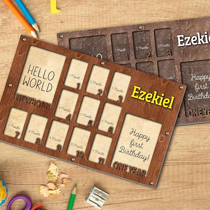 - My First Year Photo Frame: Capture your baby’s first year with our babys first year picture frame. This baby first year photo frame helps you record their growth from newborn to one year, showcasing each milestone in a 12 month picture frame for baby first year. The wooden plaque includes space for your baby’s full name, making it a personalized keepsake. Our 12 month pictures for baby first year, my first year photo board, one year photo board is a wonderful way to celebrate these moments.