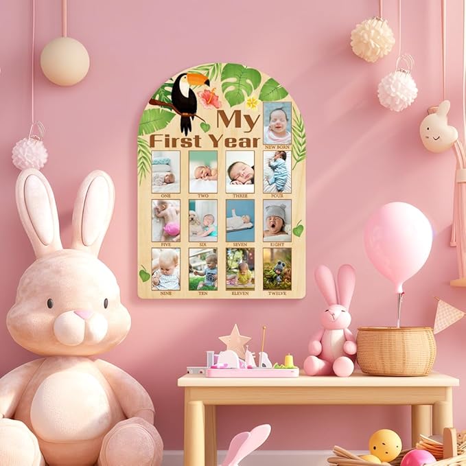 ORIGACH My First Year Baby Growth Photo Display Wood Board - 12 Months Newborn Milestones Photo Board - Neutral Baby Keepsake Board 1st Birthday Party Nursery Decor New Mom Gift - Toucan & Leaves