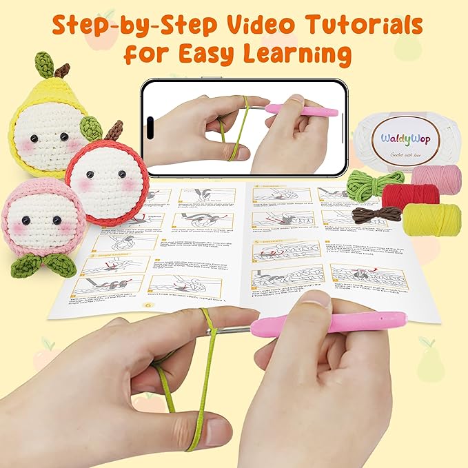 - Complete Beginner's Crochet Kit: This complete beginner crochet kit for kids adults by WaldyWop includes all the crochet accessories you need to create 3 cute fruit-themed squishy toys. The crochet kit for beginners kids features 6 vibrant crochet yarn colors, an ergonomic crochet hook, stitch markers, a yarn needle, 3 crochet stress balls, a cream blush, a glue stick(for craft eyes), and an easy-to-follow paper and video instruction book. No extra tools needed—perfect for beginners and girls ages 8-12 to get into crochet crafting with ease.