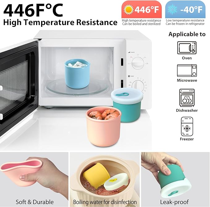 - Food Grade Silicone: These small food storage containers with lids are made of food-grade, BPA free silicone. They are soft, flexible and durable, smooth and reusable. Each come with a snug-fitting silicone lid, ensuring freshness and spill-free storage