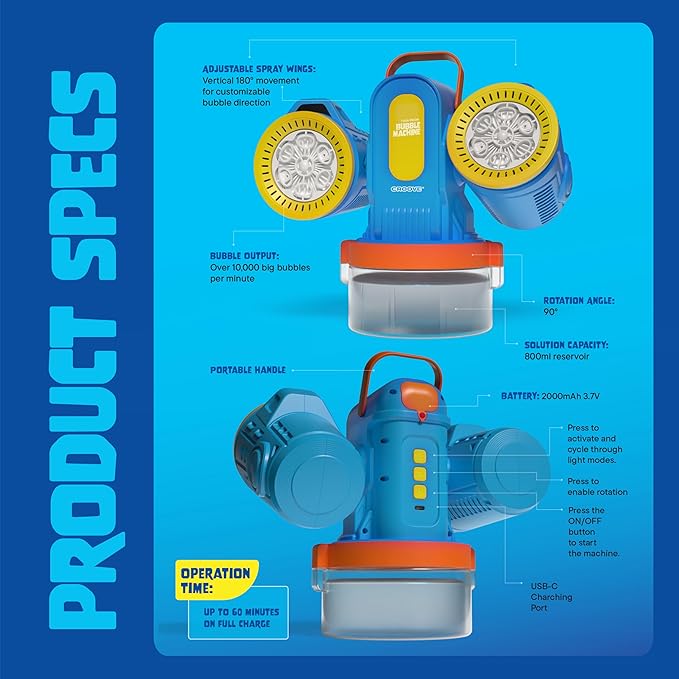 - TWIN-ENGINE POWER & FULL-MOTION EXCITEMENT: Unleash a whirlwind of fun with dual high-speed fans, 180° automatic rotation, and 90° adjustable blower wings—creating a dazzling bubble storm of 10,000+ giant bubbles per minute. Get ready for nonstop action and jaw-dropping bubble magic.