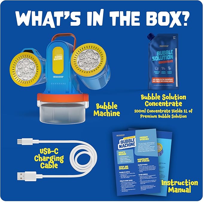 - WHAT’S INCLUDED: A bubble machine, 100ml bubble concentrate (Yields 1L), an easy-to-follow user manual—all packed in a beautifully designed, kid-friendly set suitable for ages 3 and up.