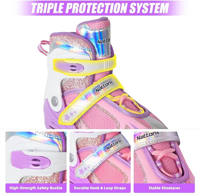 - PERFECT BIRTHDAY/CHRISTMAS GIFT: Nattork inline skates can be a perfect birthday/Christmas gift for your kids, grandchild or nieces and nephews. The kids will have a happy childhood and great gifts. Affordable for beginners, we aim to provide a high quality experience. Suitable for over 4 years old children