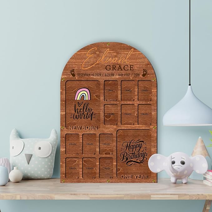 - My First Year Photo Frame: Capture your baby’s first year with our babys first year picture frame. This baby first year photo frame helps you record their growth from newborn to one year, showcasing each milestone in a 12 month picture frame for baby first year. The wooden plaque includes space for your baby’s full name, making it a personalized keepsake. Our 12 month pictures for baby first year, my first year photo board, one year photo board is a wonderful way to celebrate these moments.