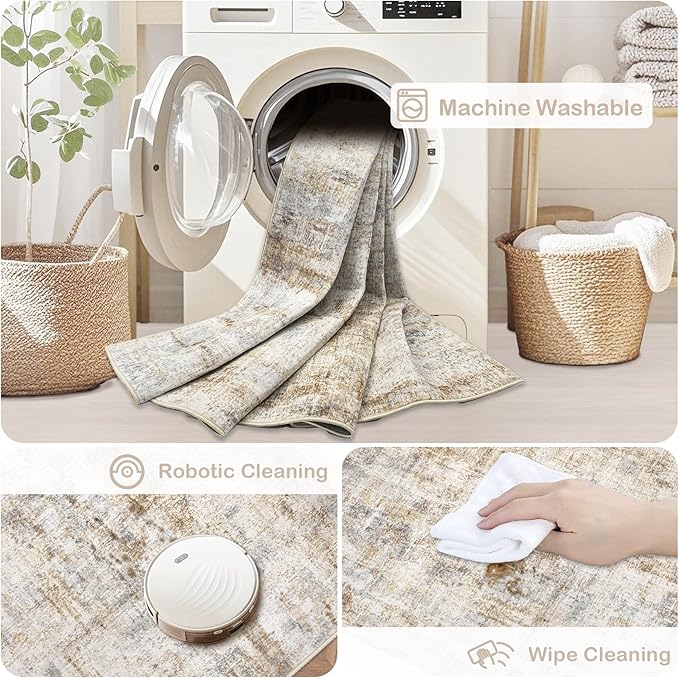 - Anti-Stain Low Pile Rug: Our washable rugs surface pile are short and dense, can block dust and hair embedded, spilled drinks coffee and other liquids will not penetrate into the neutral rug inside; Our 5' x 7' large rug is moderately thick and won't snag on doors, which not only keeps indoor rugs clean, but also adds convenience for high traffic areas.