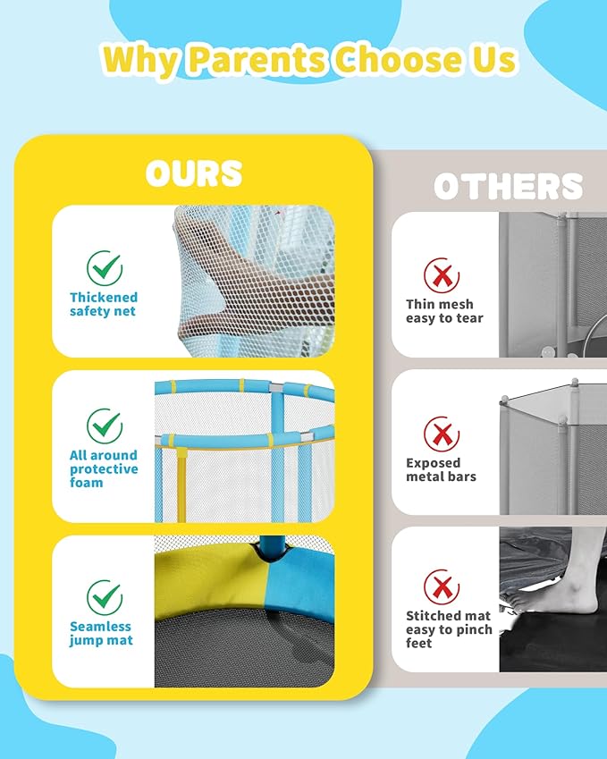 - 【All-Around Safety Design】This outdoor trampoline features a thickened mesh safety net, 360° foam-padded handlebars, and a seamless PP jump mat—no gaps, no pinched toes. It meets the strict ASTM F381-16 safety standard for consumer trampolines, ensuring peace of mind for parents. Every part is independently tested for stability, long-lasting durability, and safe play for children aged 1–8, whether indoors or outdoors.