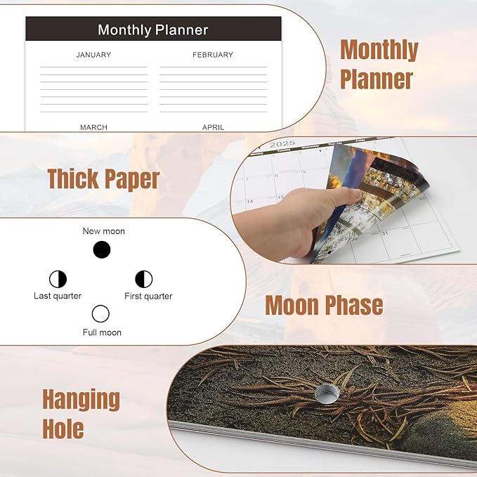 - 🏞️【Easy to Hang & Stickers】- The calendar 2025-2026 is easy to hang, each page is equipped with a well-positioned hanging hole, and the hanging hole is kept at a certain distance from the edge, not easy to break. We also include three stickers for your convenience to mark events. Additional monthly planner on the last page.