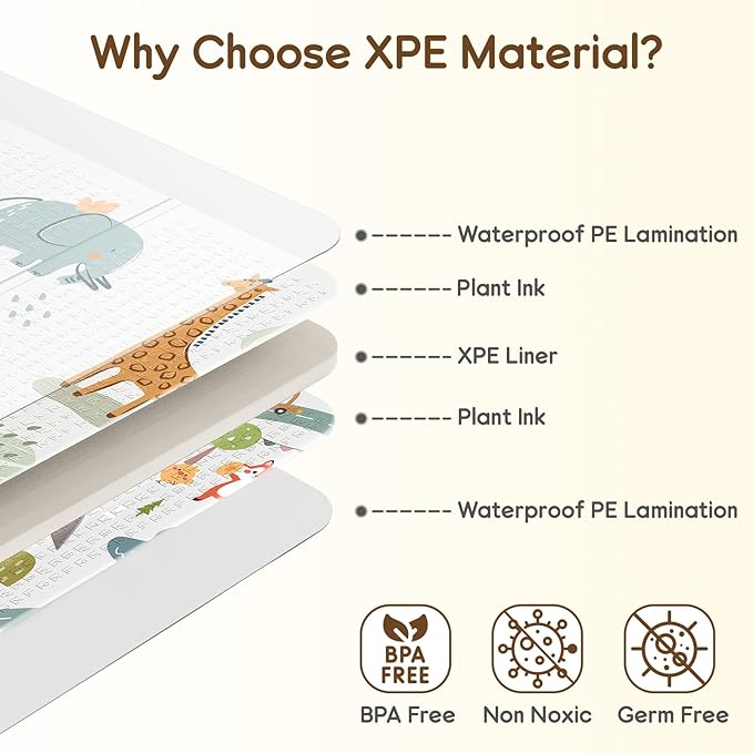 - [Safety First: Non Toxic Play Mat] - Crafted from high-density, non-toxic XPE foam, this baby crawling mat prioritizes your baby's safety. This foldable baby play mat is rigorously tested and certified free from harmful substances like BPA, lead, phthalates, and formaldehyde, ensuring a soft and protective barrier for delicate skin during playtime.