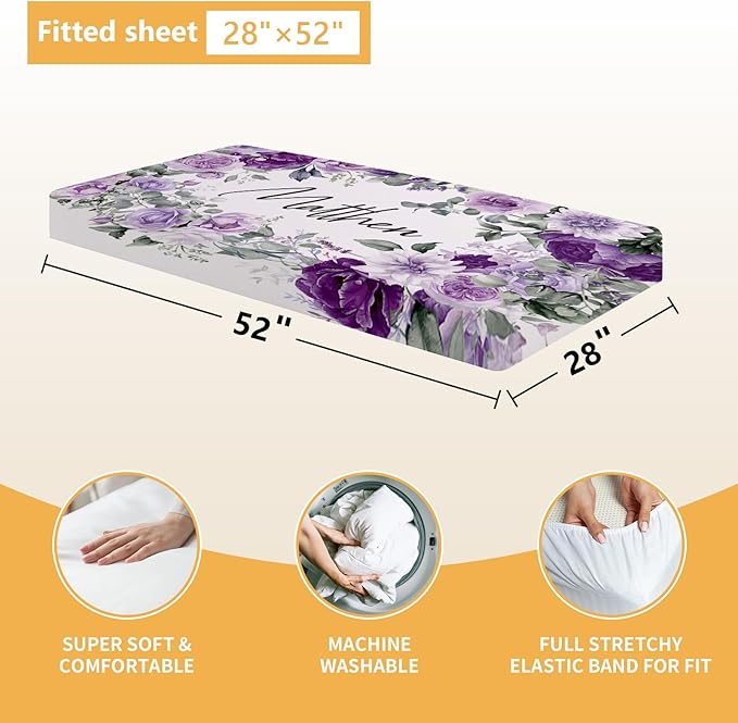 Personalized Baby Bedding Set - 5 Pcs Custom Toddlers Bedding Set with Infant Name - Soft Double Layer Nursery Crib Set for Girls Boys - Customized Infant Gifts for Baby Shower - Purple Flowers