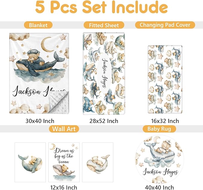- Complete Set: This customized baby bedding set includes a double layer dotted backing blanket, crib sheet, changing pad cover, baby rug and wall arts, designed to add style and comfort to your nursery. The dotted backing of the double-layer blanket will be adored by your little one.
