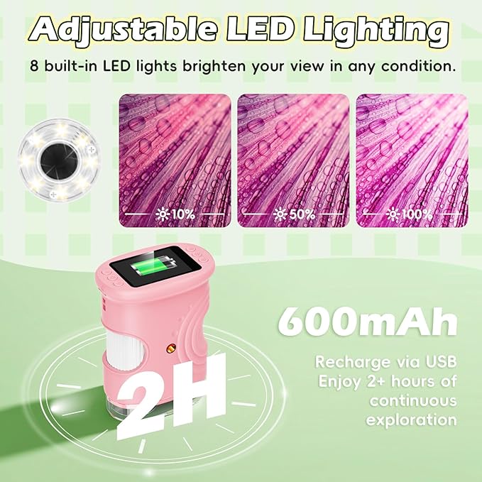- Portable Pocket Size for On-the-Go Science: Weighing only 136g (0.3 lbs) and measuring about 4” x 3.15” (10cm x 8cm ), this mini microscope for kids fits perfectly in toddlers' small hands and pockets. It comes with a convenient neck strap, a compact and lightweight design makes it ideal for both indoor fun and outdoor adventures, encouraging discovery anytime, anywhere